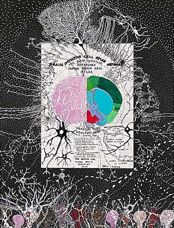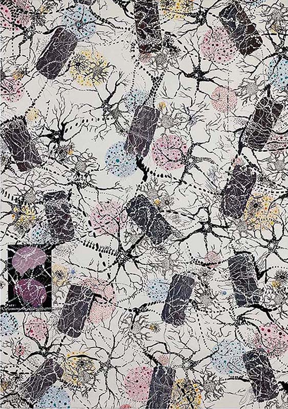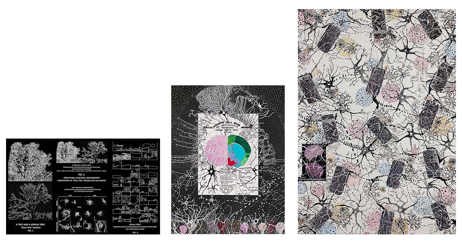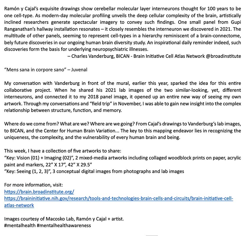 | "Key: Seeing (1, 2, 3)", 3 conceptual digital images from photographs and lab images "Key: Vision (01) + Imaging (02)", 2 mixed-media artworks including collaged woodblock prints on paper, acrylic paint and markers, 22" X 17", 42" X 29.5" |