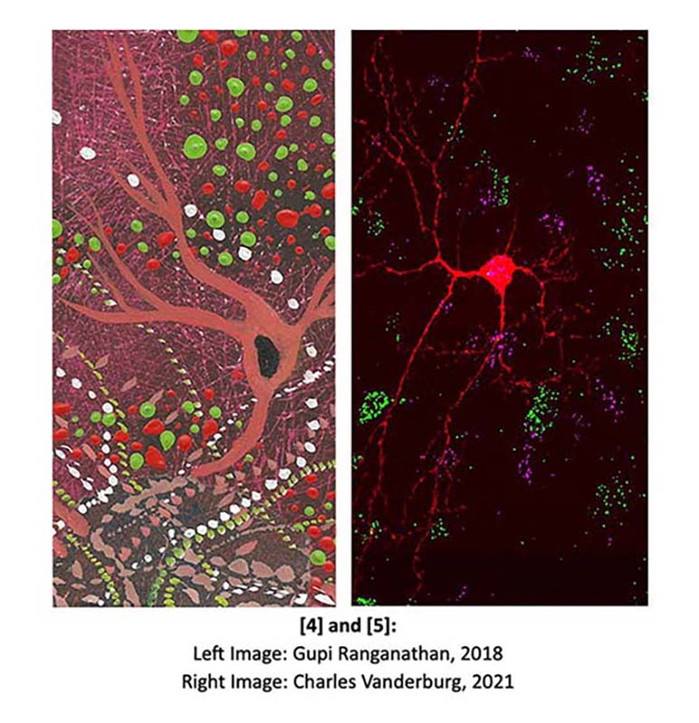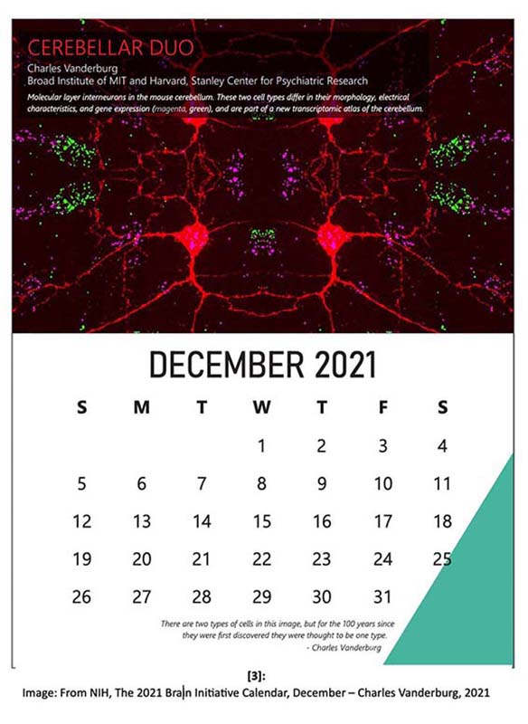 | Paper on MLI1 and MLI2 cells | Image from the NIH, 2021 Brain Initiative calendar, December | Left Image: Gupi Ranganathan, 2018 - Right Image: Charles Vanderburg, 2021 |