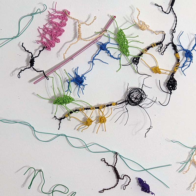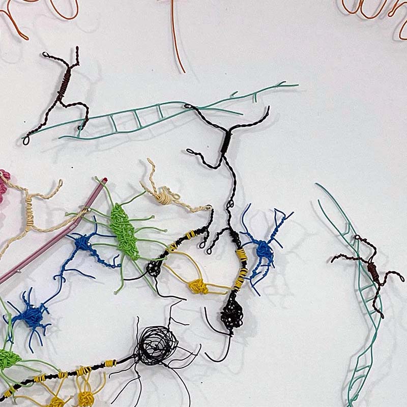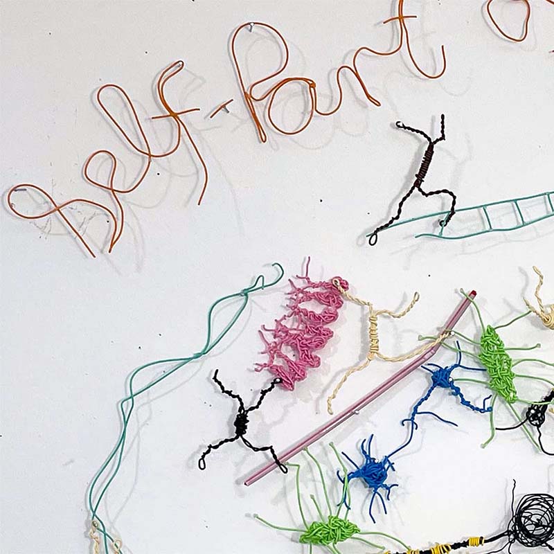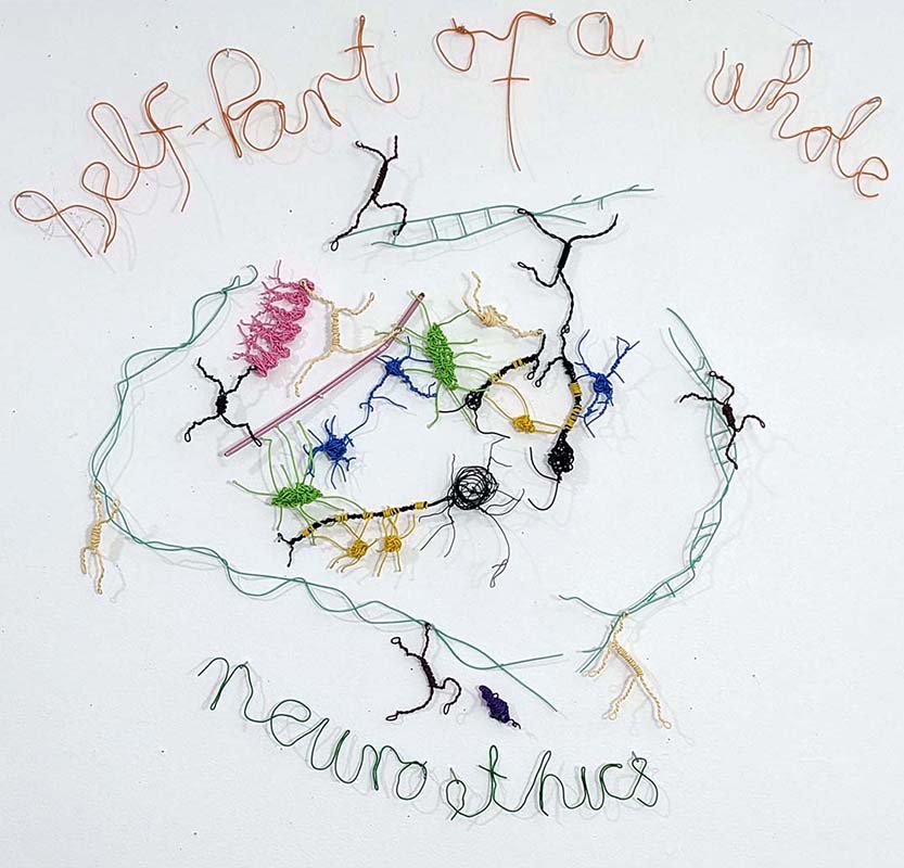 | "Self – Part of the Whole", 2023, an installation of wire sculptures including metallic wire, insulated wire, glue dots, and brads, 26" X 29". | ||