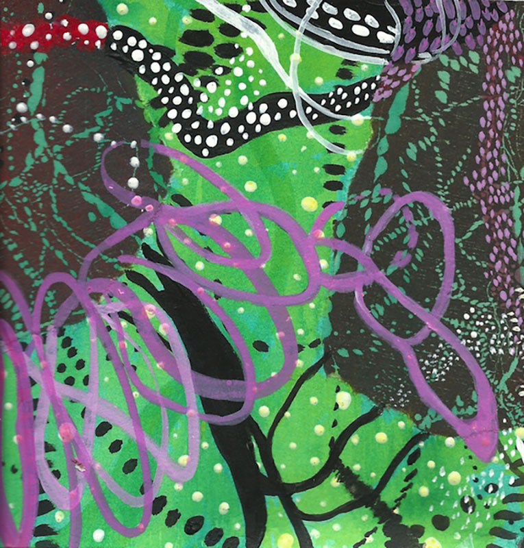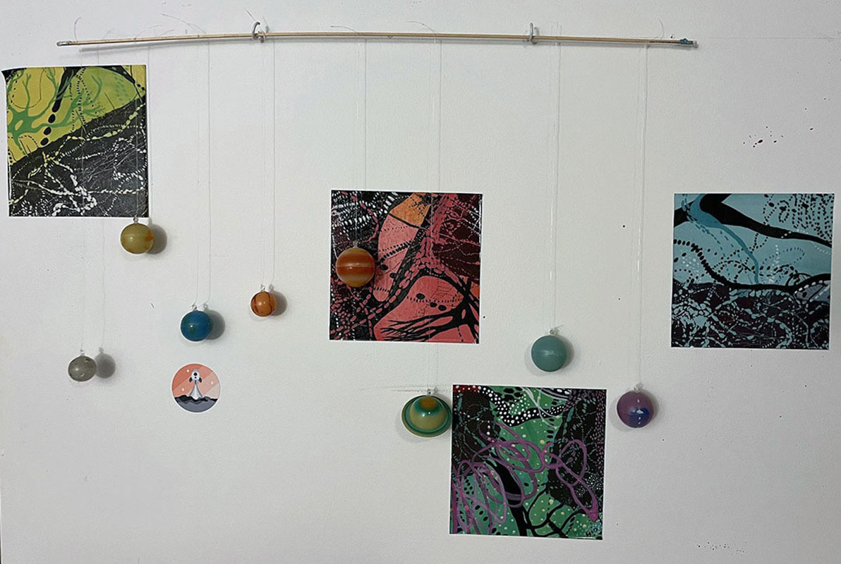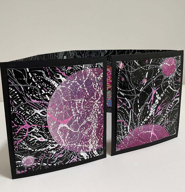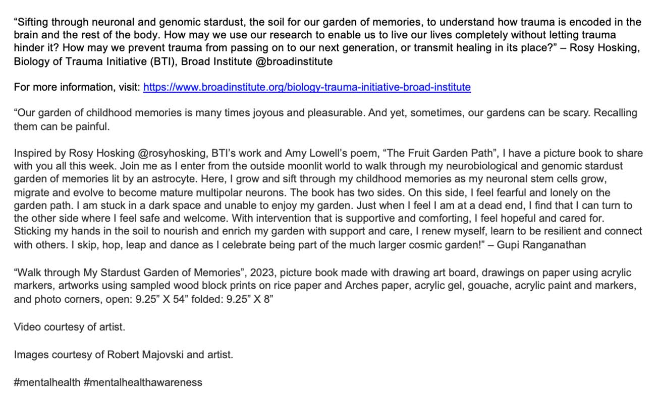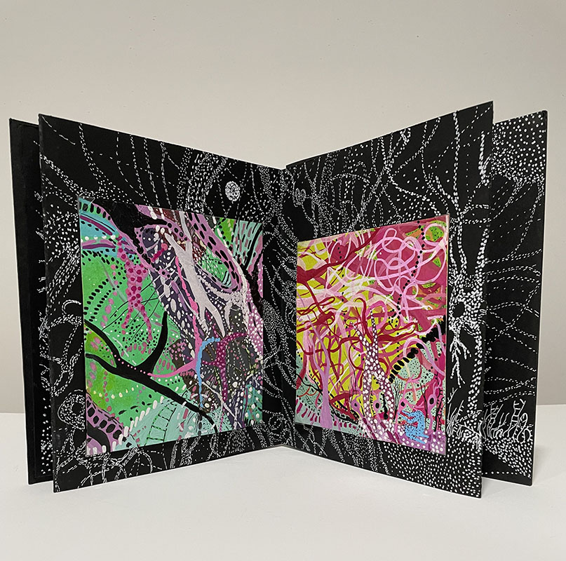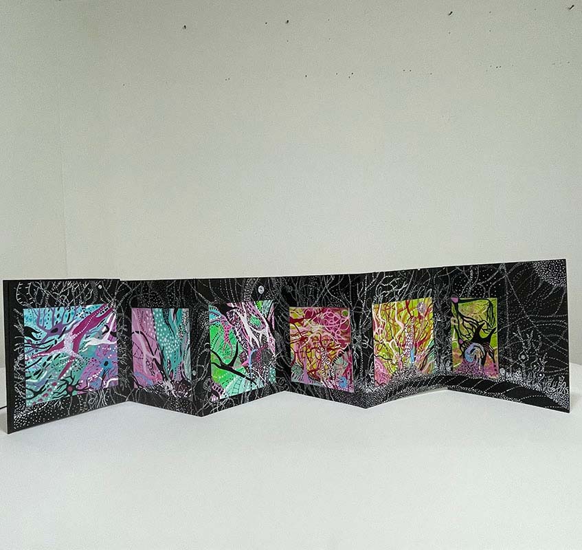 | Walk through My Stardust Garden of Memories, 2023, accordion picture book made with drawing art board, drawings on paper using acrylic markers, artworks using sampled wood block prints on rice paper and Arches paper, acrylic gel, gouache, acrylic paint and markers, and photo corners, open: 9.25" X 54" folded: 9.25" X 8" | |||